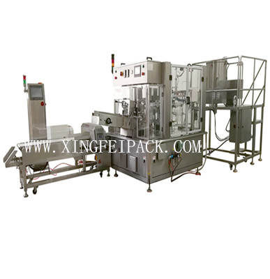 包裝流程(工位分布):1)上袋—2)色帶(噴碼)打碼(選項(xiàng))—3)開(kāi)自立袋底—4)開(kāi)袋口—5)一次充填—6)二次充填(選項(xiàng)或者備用)—7)熱封口(同時(shí)排氣)—8)冷封口和產(chǎn)品輸出。